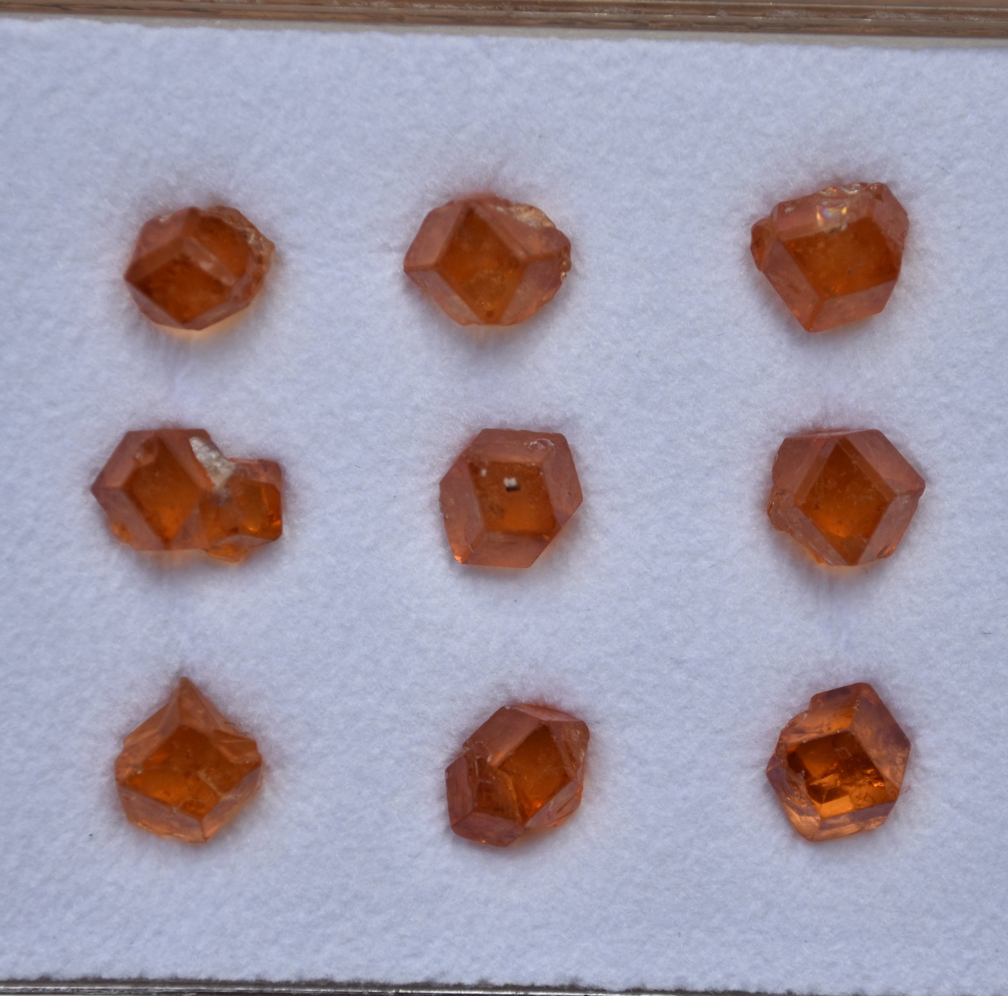 These tiny, perfect little garnets are exceptionally bright, and very richly orange colored. Very Fanta. These are a good size range for setting in jewelry. As a set, there are a lot that would work perfectly in jewelry, and a few that wouldn't. I'd estimate if you intended to find 6 that could safely be set, you would find the ones you need.