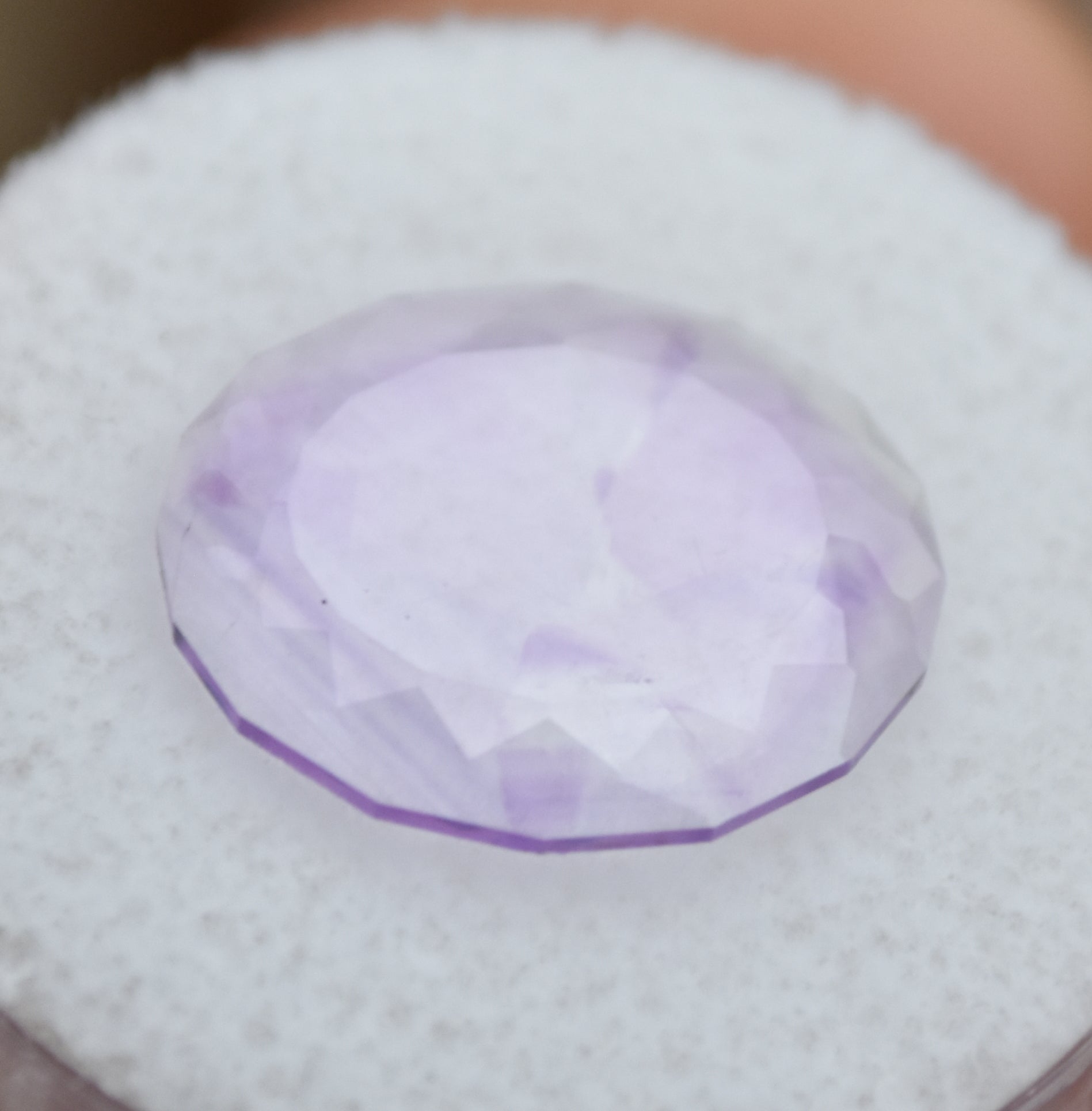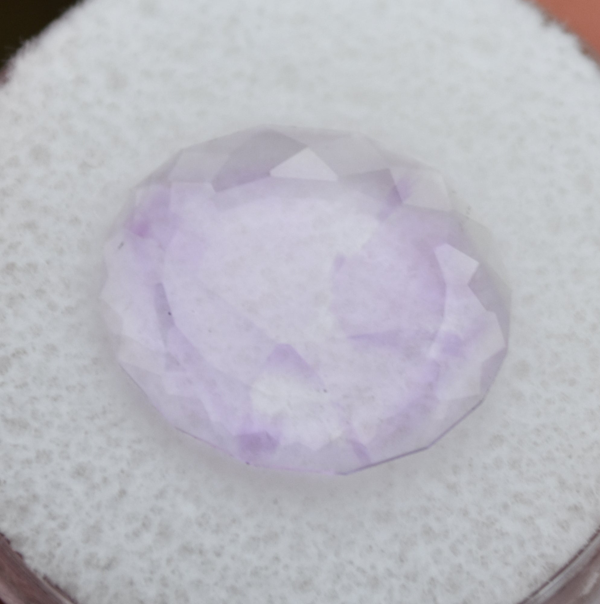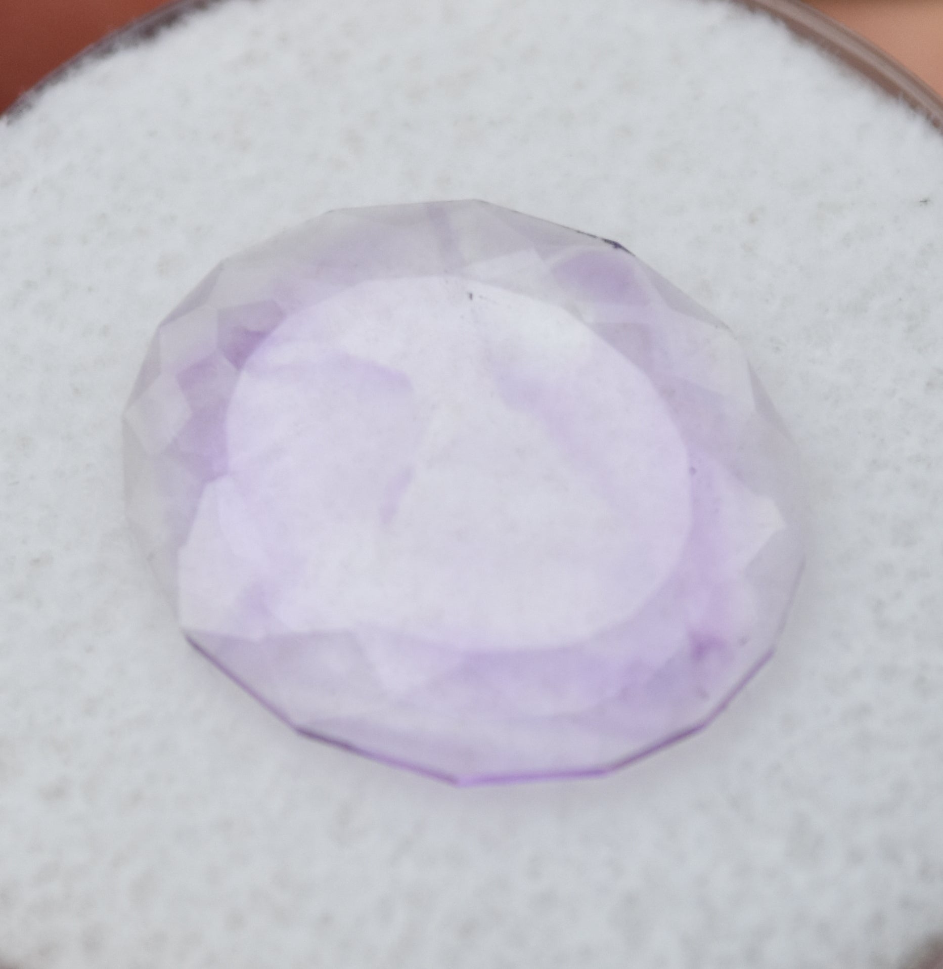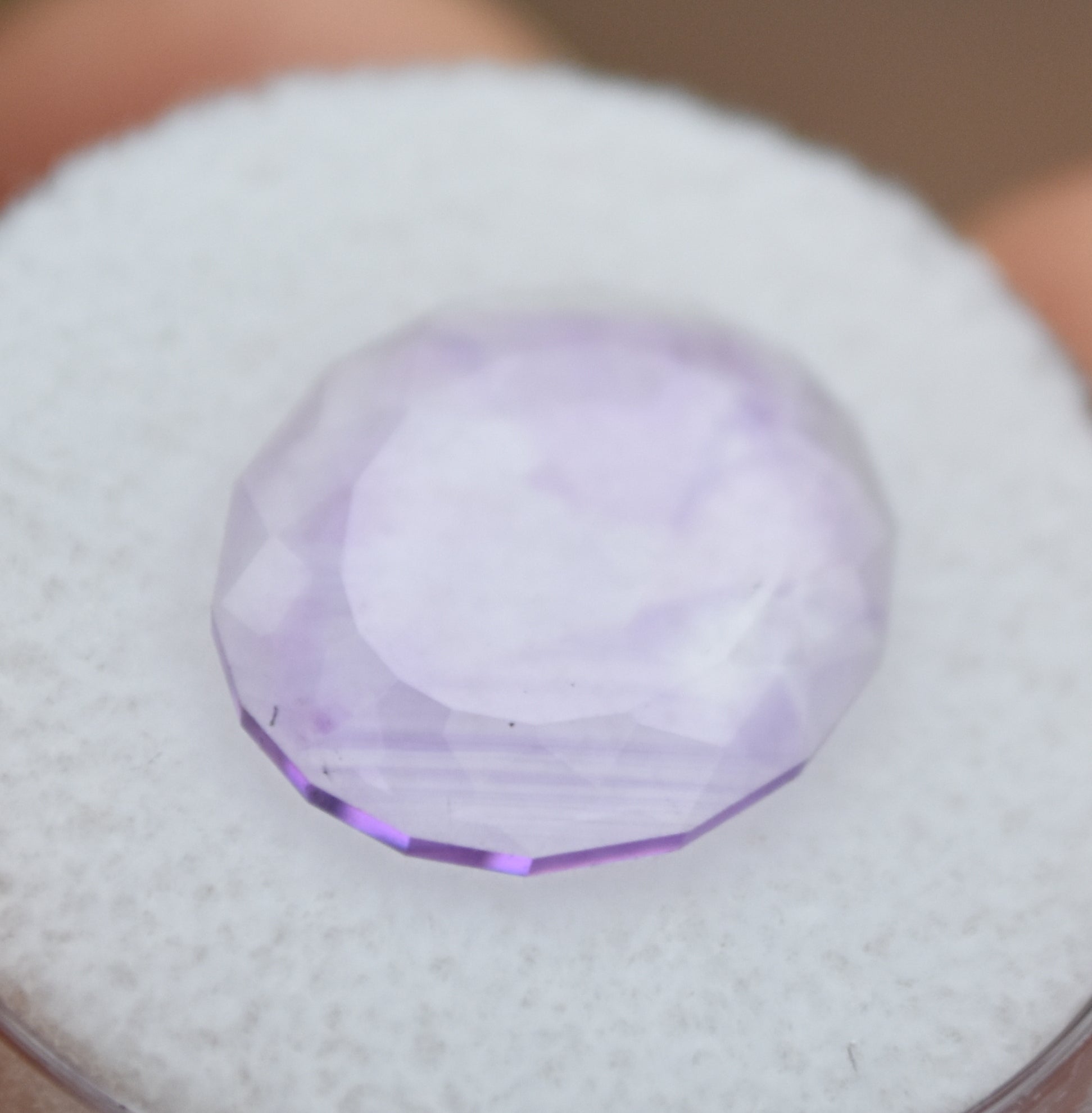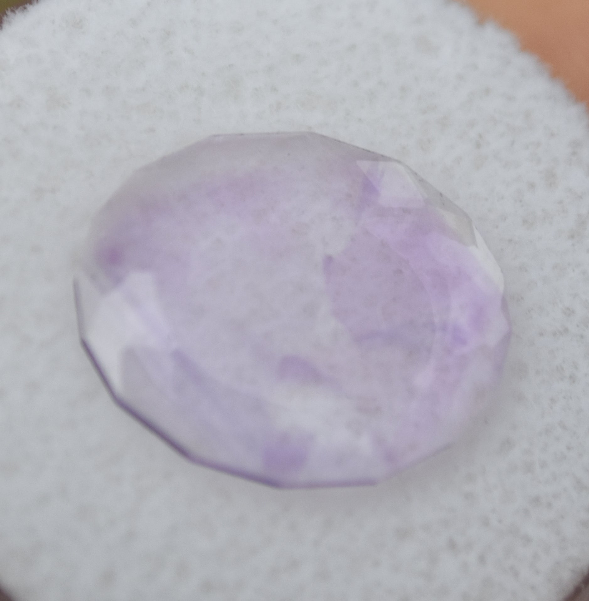 Anyway, this portrait-cut gem is awesome.  It is a cross-wise slice of a gemmy crystal that was full of purple phantom color splotches.  The result is basically a tie-die amethyst gem.  This is exactly the kind of thing you cut a portrait gem for -- to display some natural aesthetics like purple coloration swirling like drops of dye in a pool of water.