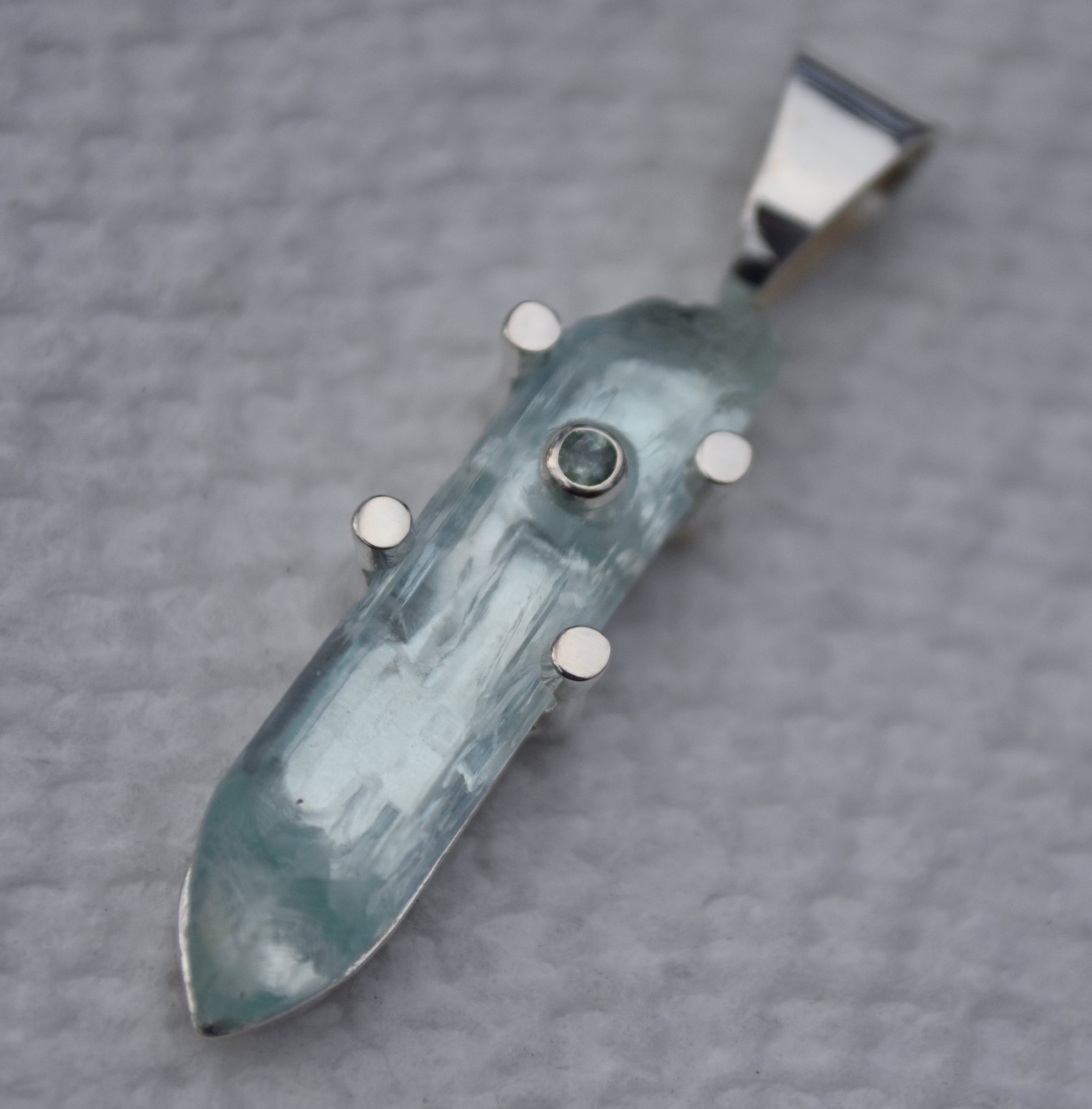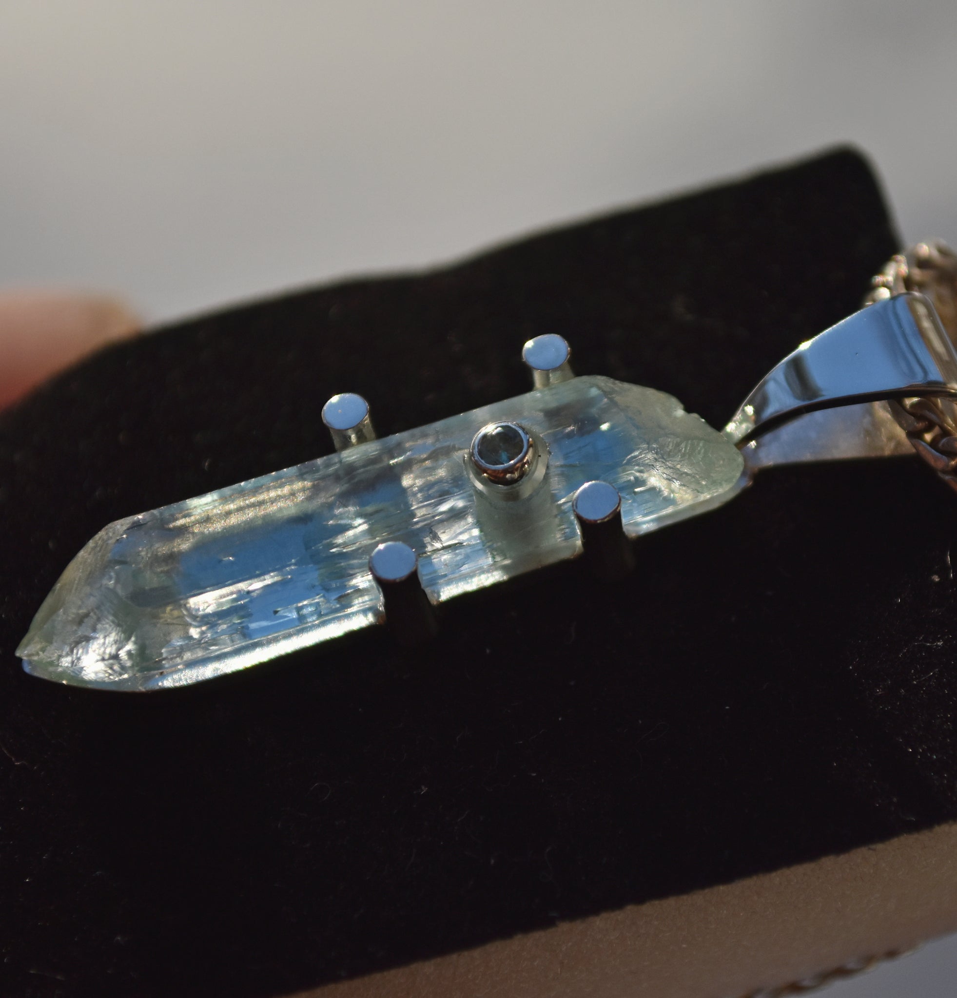 The aquamarine is beautifully etched all over, including very aesthetic terminations. The alexandrite is a nice light green, with mild silk, and a decent color change to a light purple in incandescent lighting. That's right, this pendant goes from icy with a minty green accent, to icy with a soft lavender accent.
