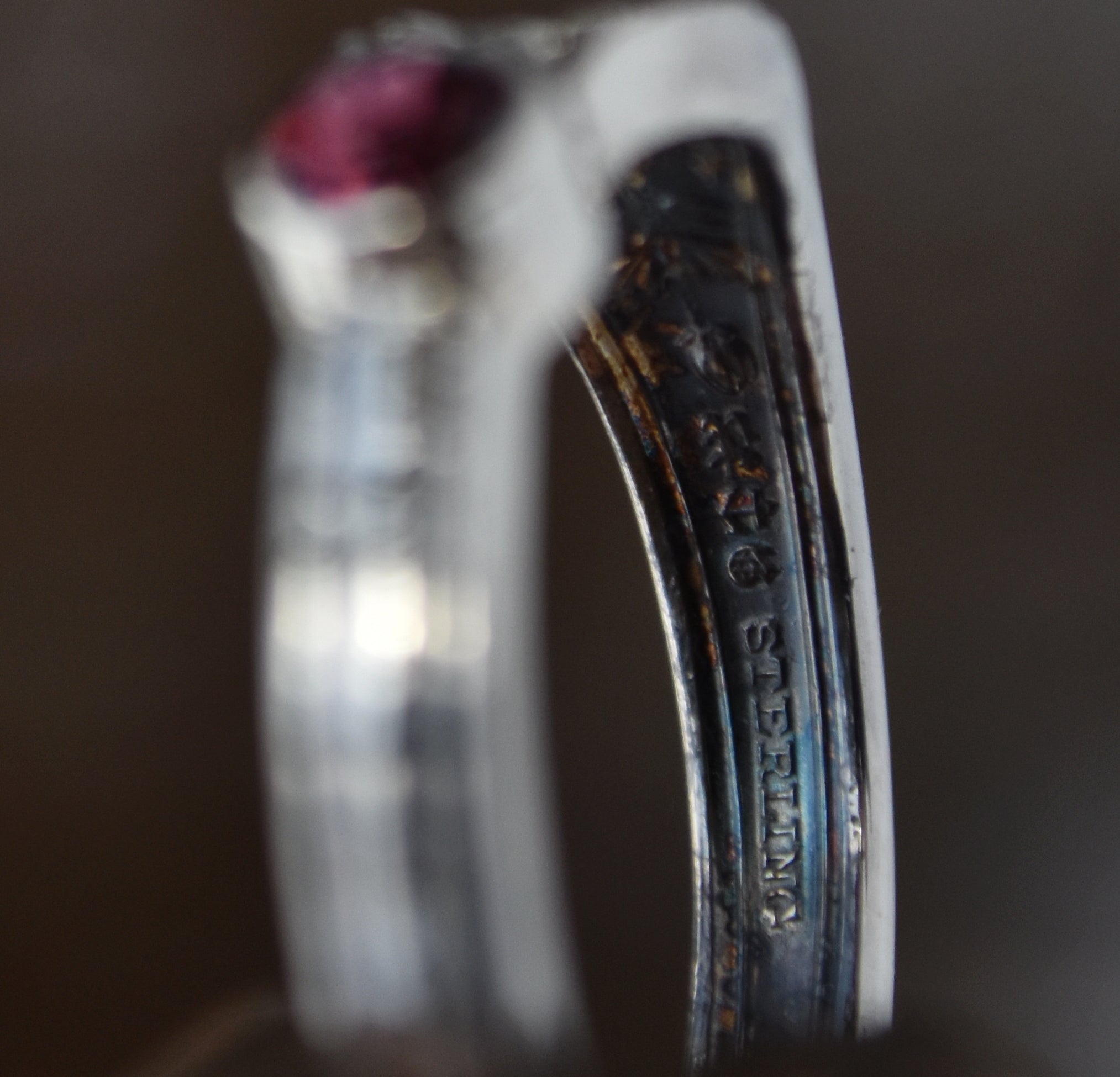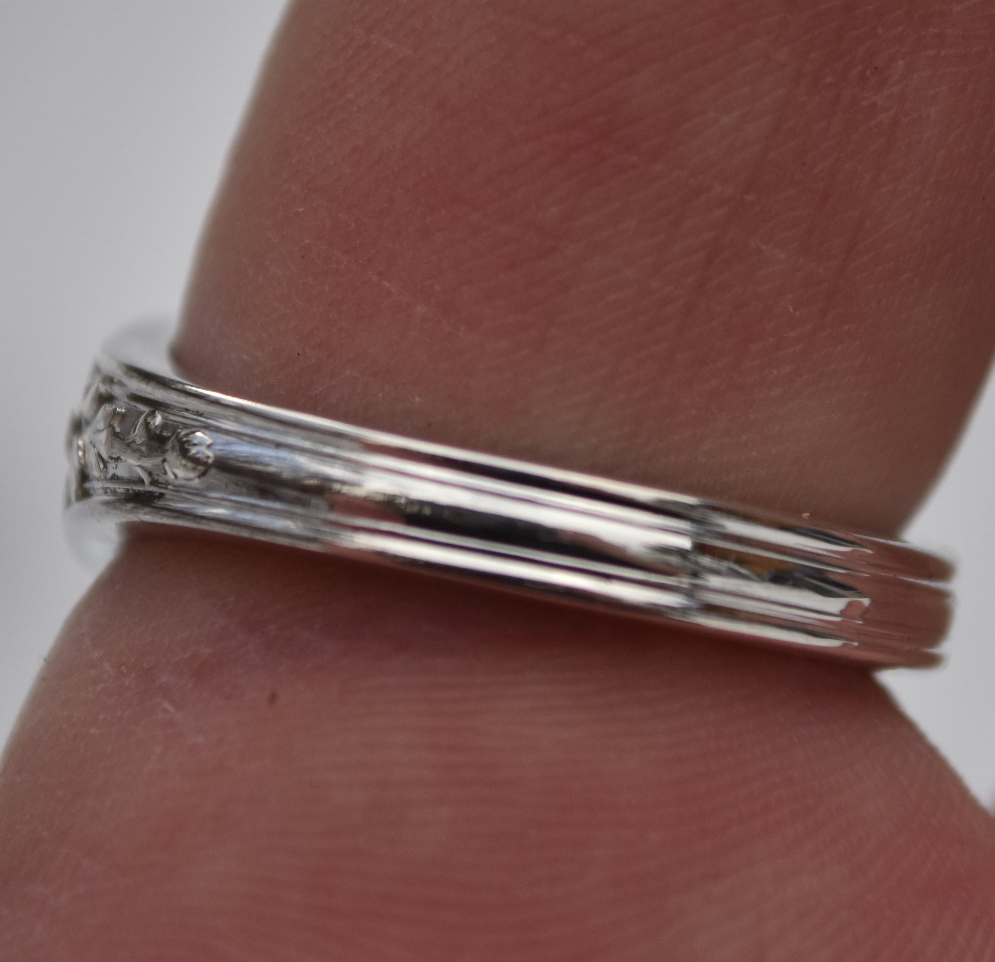 The outer surfaces of this ring are all polished to a bright, final polish, while the inside of the band was left tarnished, as a nod to the antique origin.  When you have worn this ring for a few days, much of the tarnish on the inside will have rubbed off, leaving dark areas ONLY in places like inside the lettering, and in recessed areas between border lines.  The inside tarnish will 'wear in' to a very aesthetic shading, essentially. (This can be done on the outer surface as well, if shading is desired on the floral portion. Simply take it to your local jeweler for this shading-relief treatment)