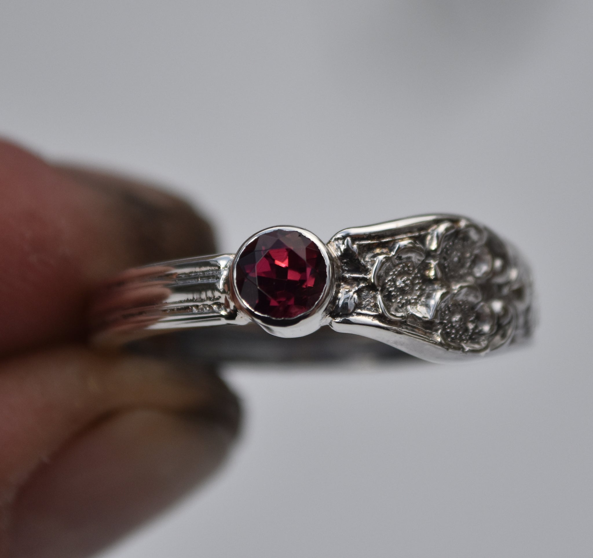 Recycled Antique Fork-Handle Ring - Wild Rose Motif - Rhodolite Garnet - Size 11.25