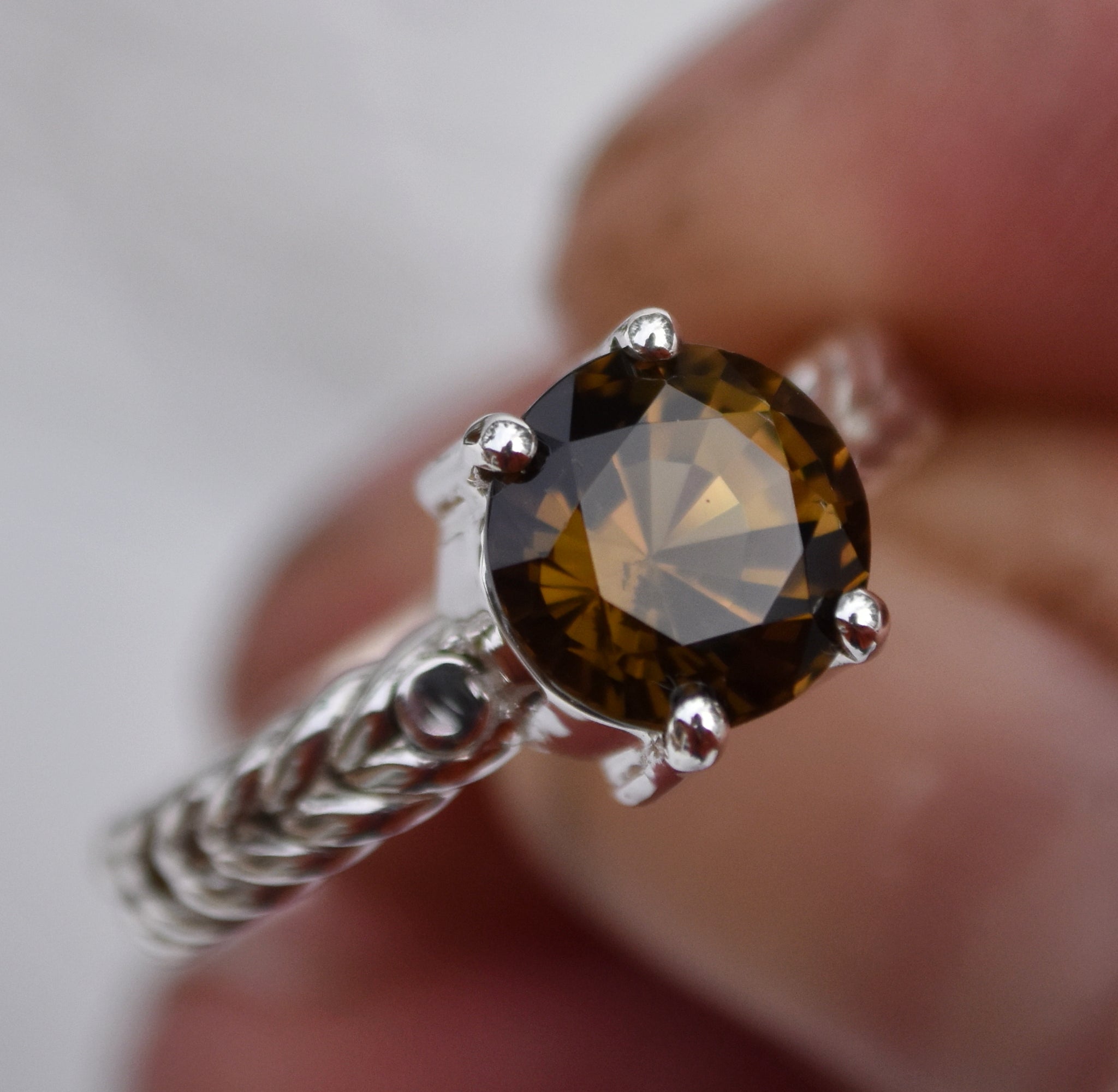 This is a custom ring design that I made a mold of, and have tried a few different things with. I really like it as a solitaire because the braided shank adds something in terms of design, without detracting from the main stone, like accent gems might.
