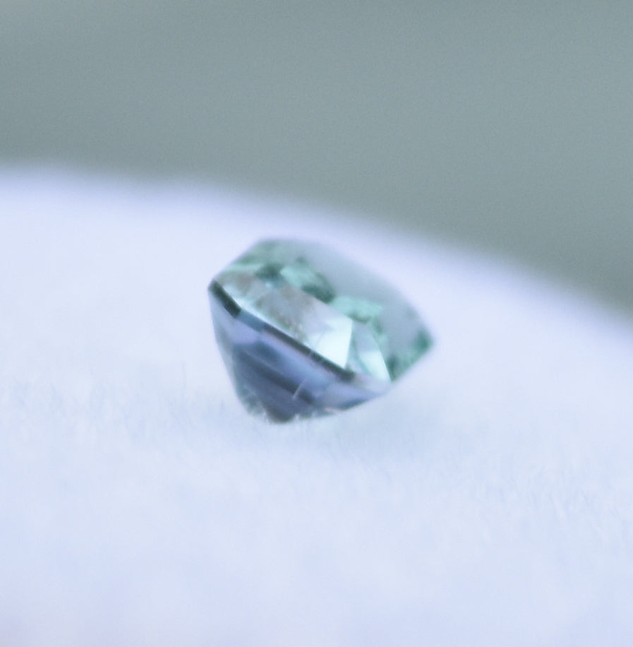 This gem faces up as teal, with a bit of blue to blue-green scintillation in the ends, where the facets overlap the most. The purple axis is visible lengthwise, through the length of the gem. You'll get purple influencing green and teal, but the actual hard purple color is relatively hard to see, except at a steep angle.