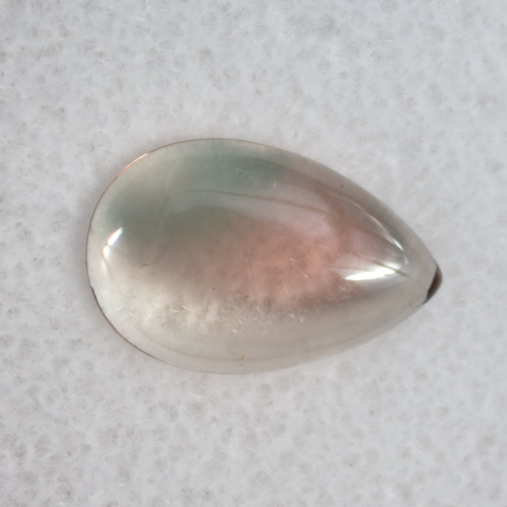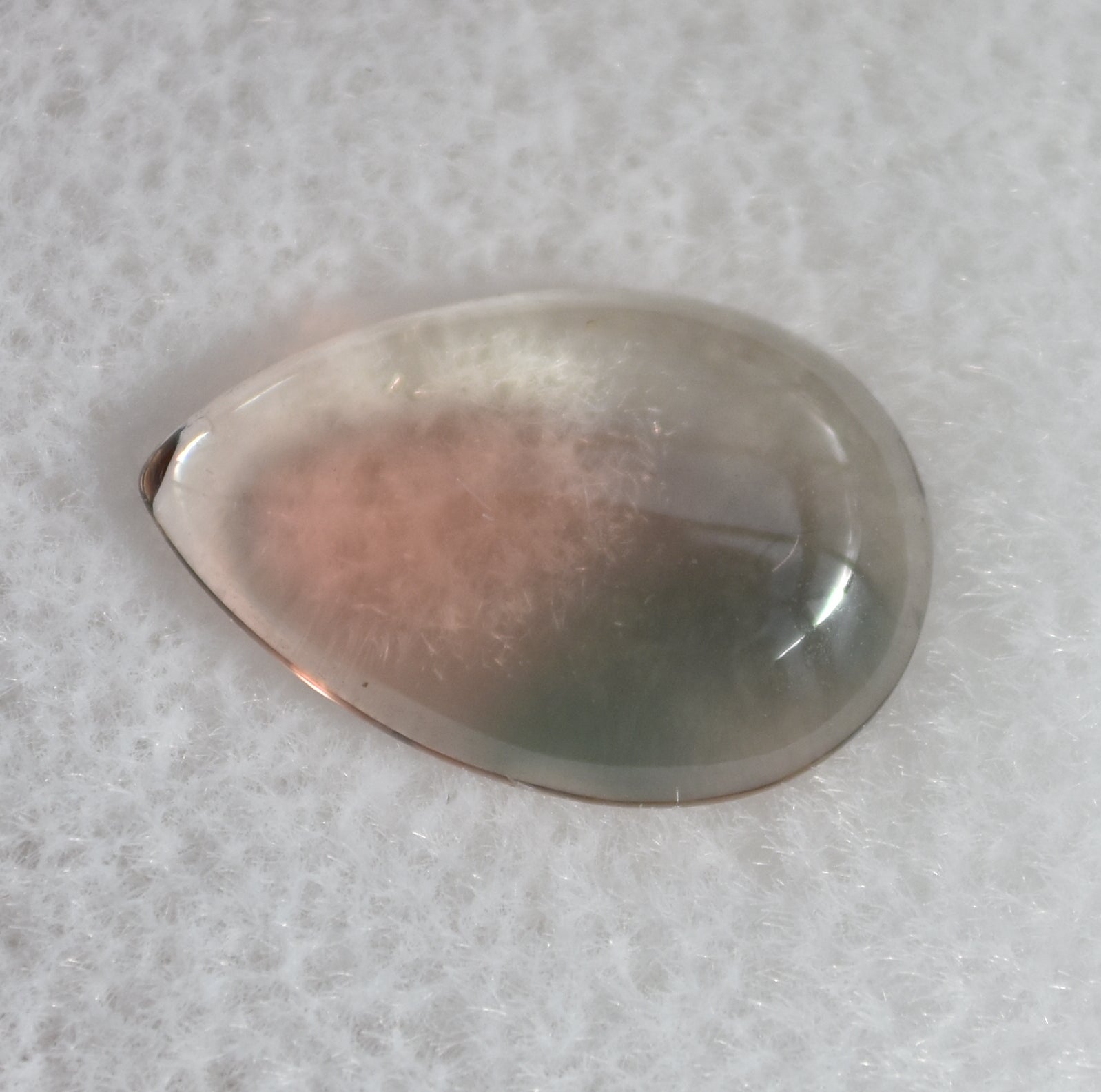 This pear shaped cabochon is quite striking! It has a bi-color patch of reddish orange coloration, partially surrounded by a big patch of rare blue-green color. It ALMOST looks like an egg, with an egg yolk... almost. There isn't any schiller in this one, at least not any that jumps right out at you.