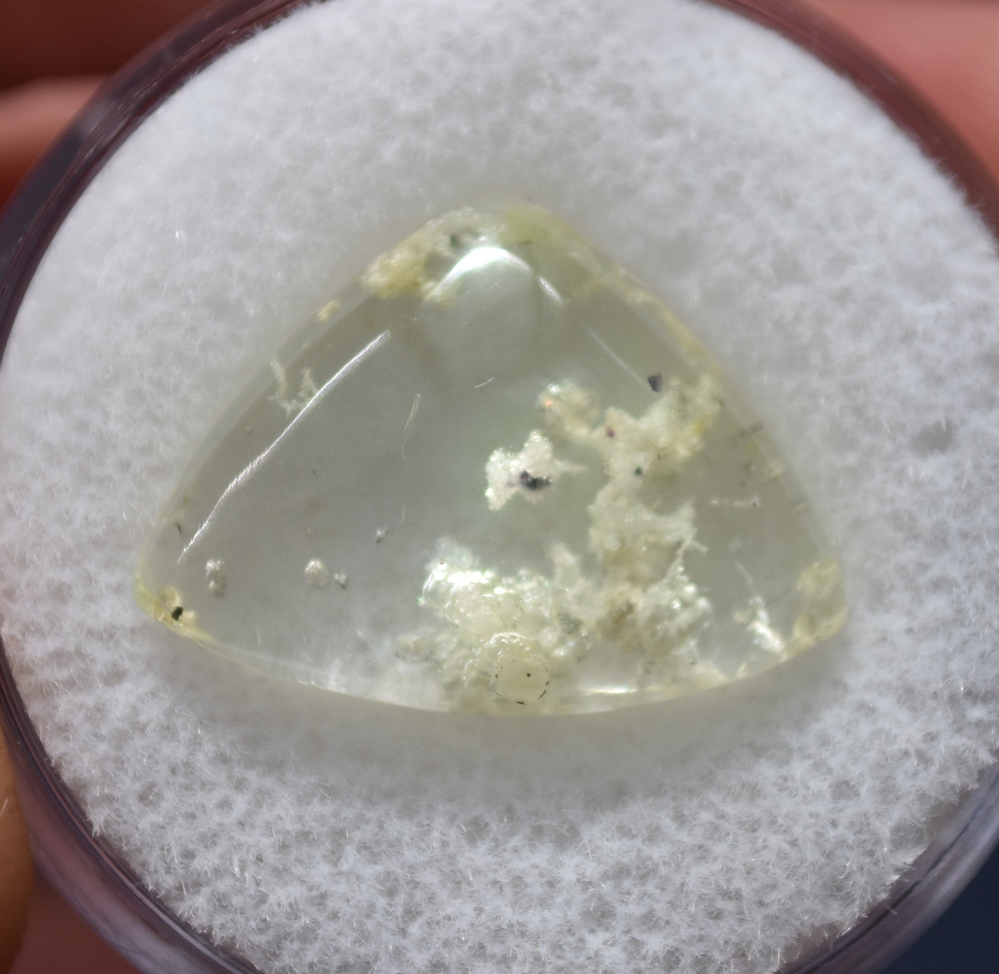There are some internal features inside the gem - which are mostly leftover spaces between layers of water-deposited silica and trace uranium. However, the very small dark spots are purple fluorite cubes. They are there, but I wouldn't say that any of them are noticeable by eye.