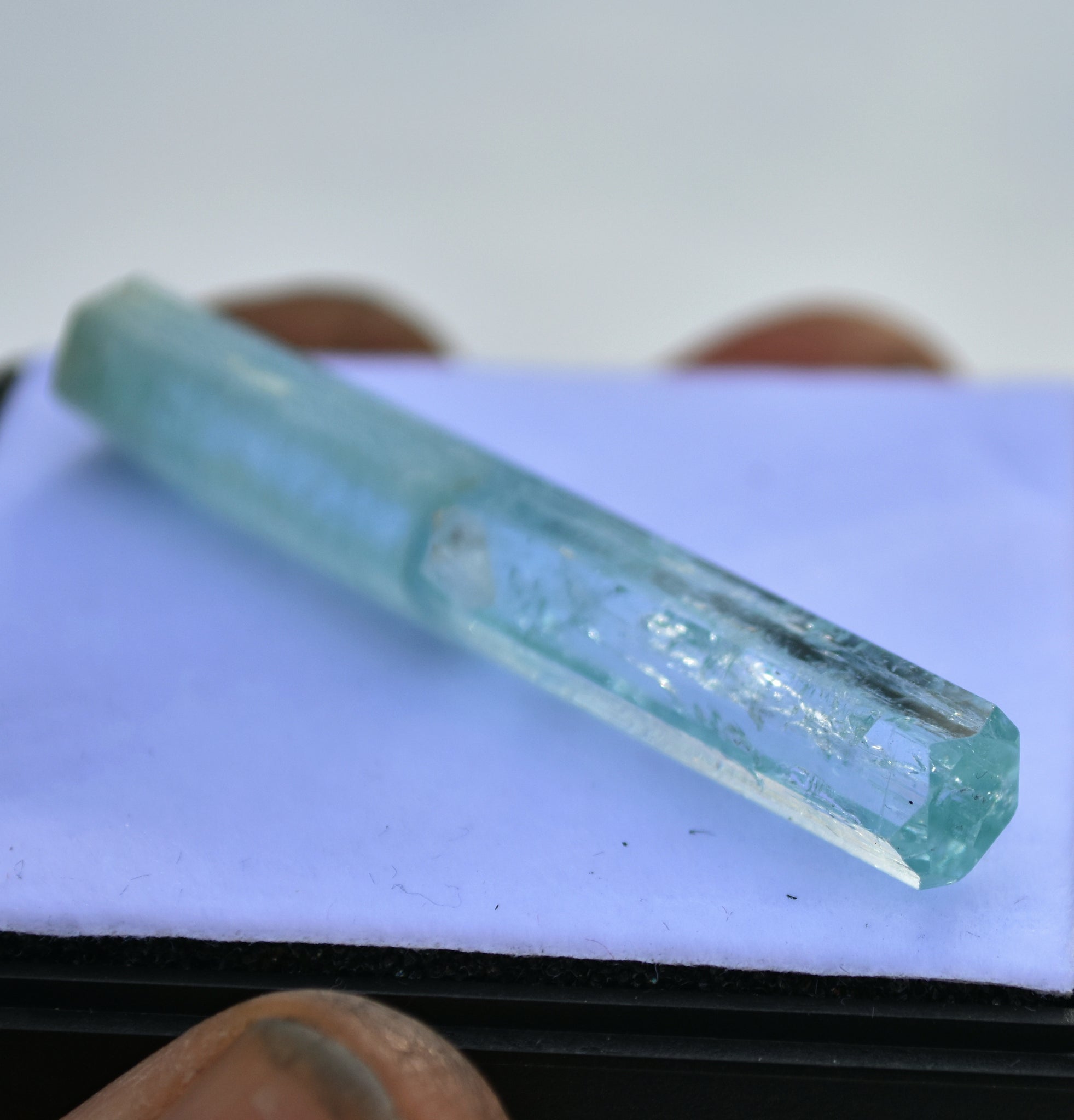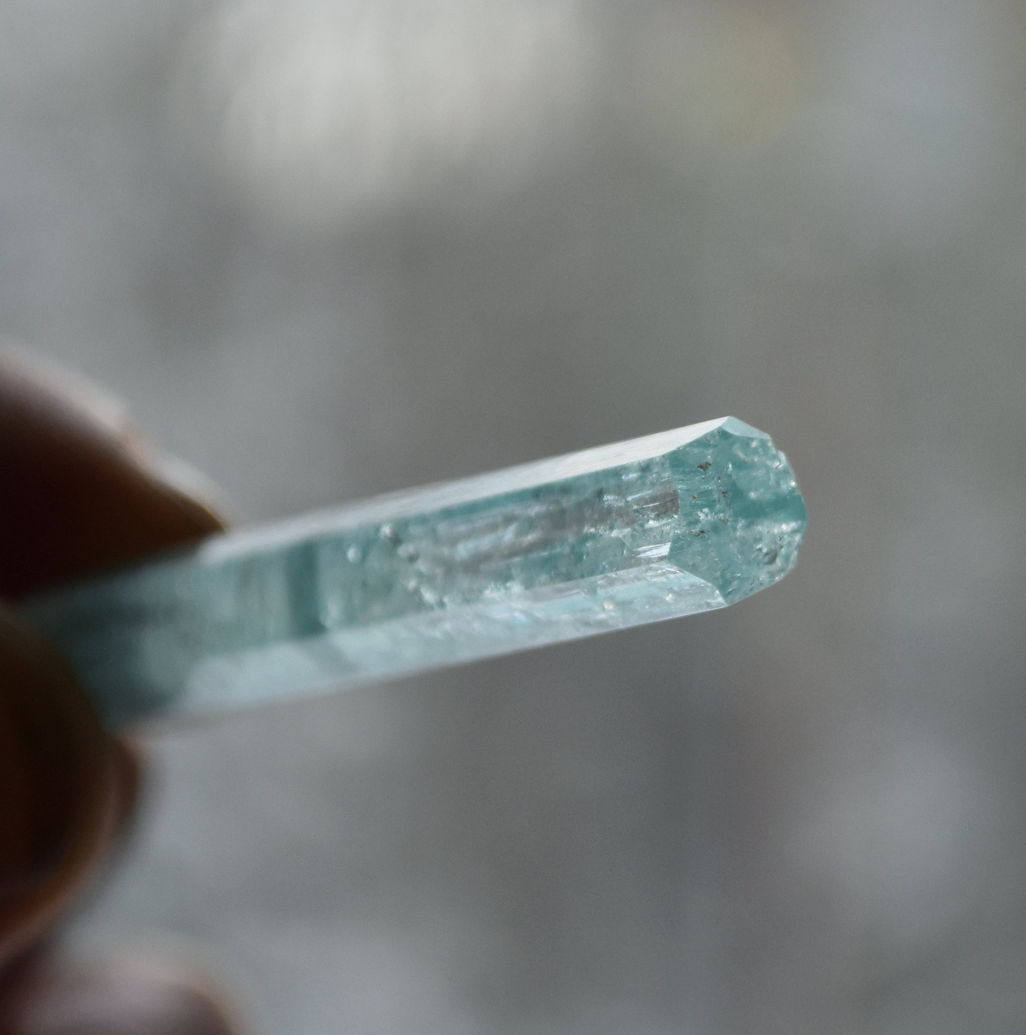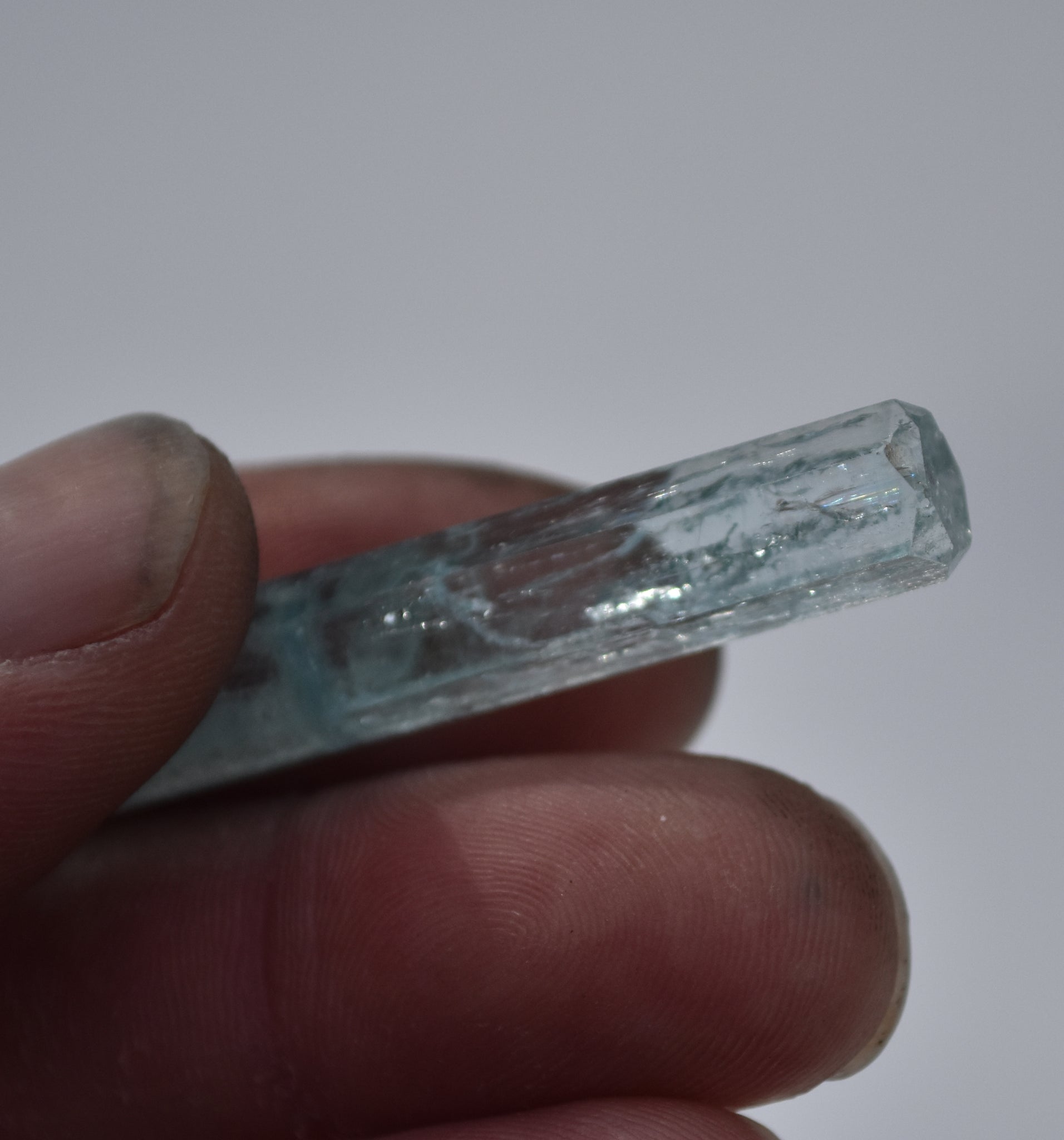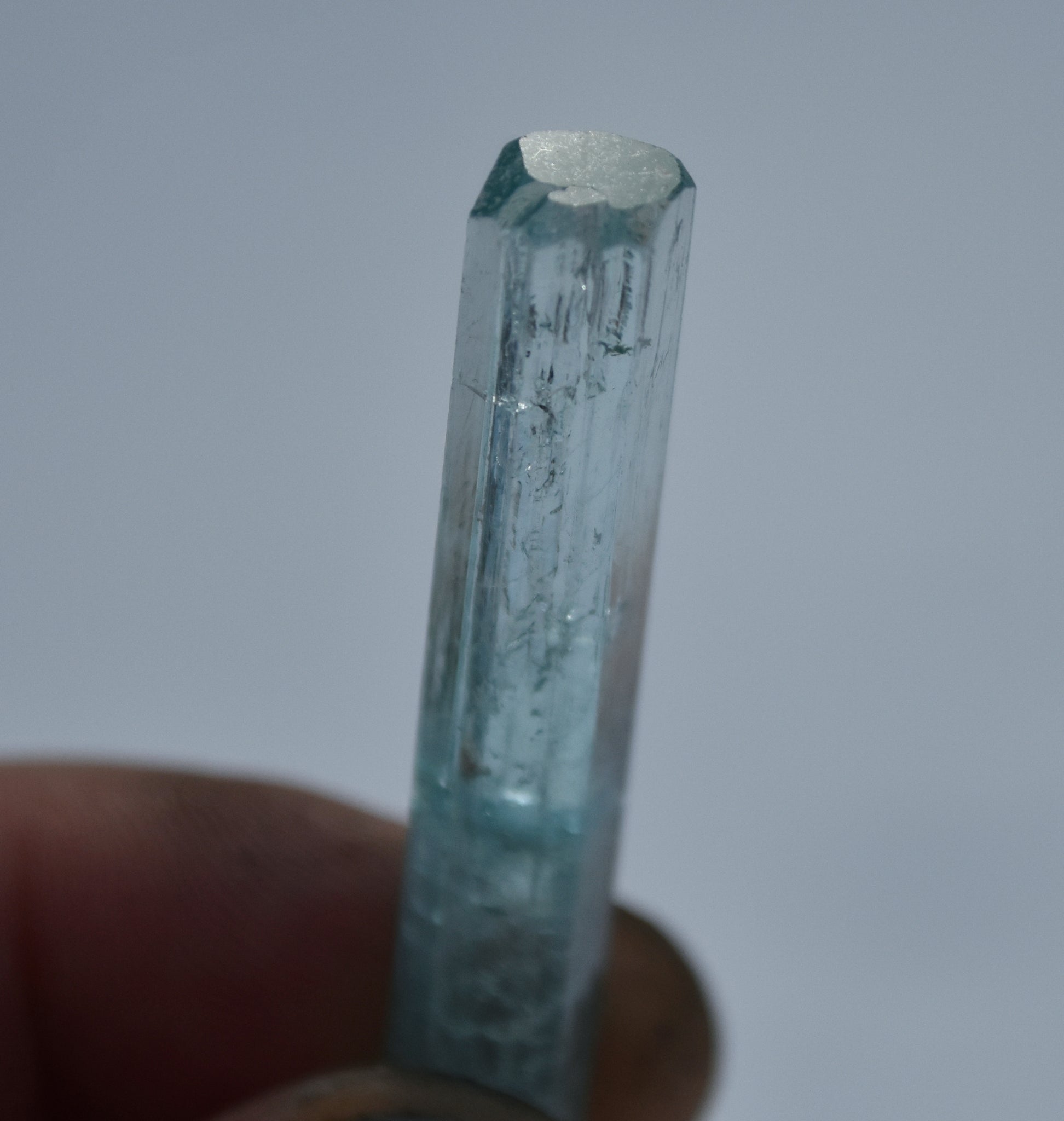 The bottom half of the crystal is little more included, a little less transparent, and has slightly stronger color. The top half Iwould characterize as extra gemmy, with interesting, stable inclusions, and capped by what I can only call an immaculate termination - It's perfectly flat and glassy on top, with triangular modifying faces at each corner.
